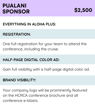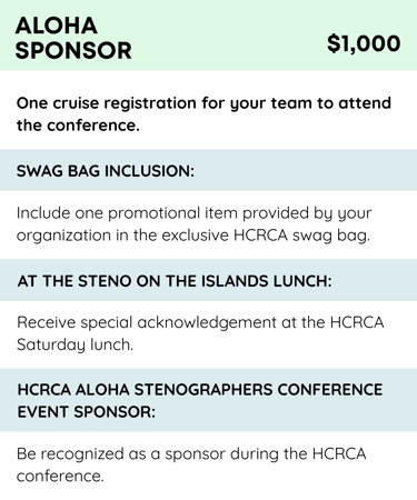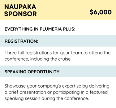 The Lei Sponsorship will include leis for all the speakers and attendees who would like a lei, a signage, and a shout out recognition at the conference.